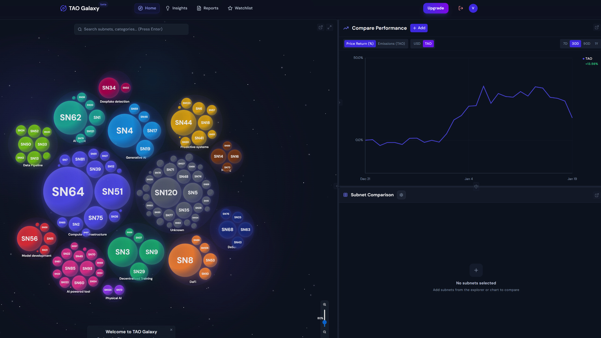 Discovery platform and research tool for the Bittensor ecosystem featuring a subnet explorer and analysis reports.